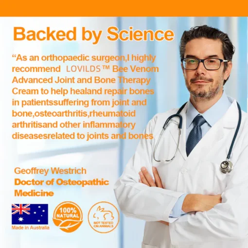 Dr. Geoffrey Westrich, a distinguished doctor of osteopathic medicine with decades of experience and numerous accolades, including the prestigious Star of Excellence Award, recommendsΒ LOVILDSβ’ Bee Venom Advanced Joint and Bone Therapy CreamΒ for those suffering from joint and bone conditions like osteoarthritis, rheumatoid arthritis, and other inflammatory diseases.