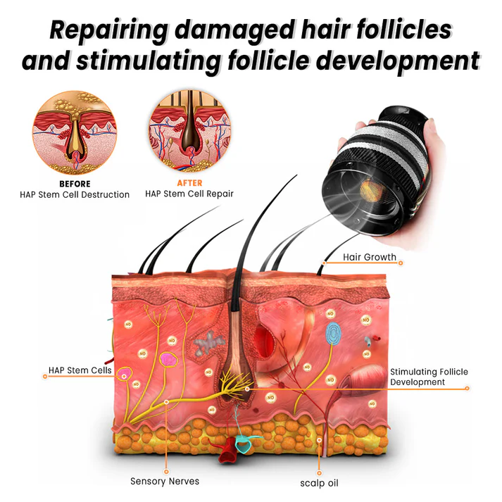Wormwood is rich in anti-inflammatory and anti-bacterial ingredients, and the LUHAKA™Moxibustion Hair Regrowth Device repairs hair follicles damaged by DHT while inhibiting bacterial growth, effectively preventing recurring hair loss. Nitric Oxide (NO) produced by the Moxibustion Device and the increase in local circulation help to reduce the level of inflammatory cytokines while promoting the repair of DHT-damaged HAP stem cells⁷. The main role of these HAP stem cells is to promote the growth of sensory nerves in the hair follicle, which in turn improves the nutritional status of the hair and stimulates hair growth.