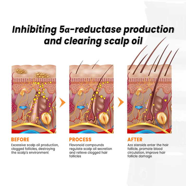 The LUHAKA™ Moxibustion Hair Regrowth Device utilizes the heat generated from burning moxa cones to swiftly open and penetrate hair follicles. Once burned, moxa cones contain various flavonoid compounds, including catechins, anthocyanins, gallic acid, and rutin⁵. These compounds regulate scalp oil secretion, eliminate accumulated oil in hair follicles, and alleviate follicle blockage. Upon entering the hair follicle, the production of azo steroid aids in promoting local blood circulation. Simultaneously, it inhibits the body’s production of DHT by reducing the 5α reductase enzyme, thereby enhancing the scalp environment and preventing hair follicle damage.
