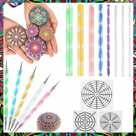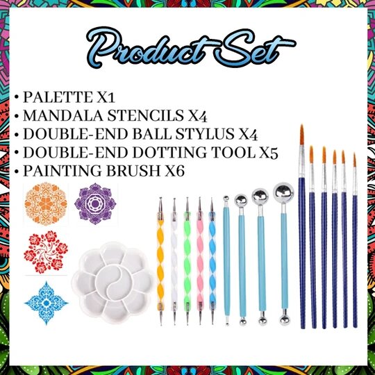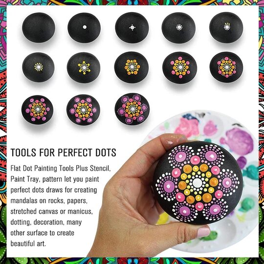 Mandala Art Dotting Kit has a WIDE RANGE of USAGE as it can be USED for Paper Art, Wood Art, Stone Art, Nail Art, and more. It ALLOWS you CREATE PERFECT DOTS and CIRCLES for an ENDLESS AMAZING DESIGNS. The KIT is COMPOSED of 1 PALETTE, 5 INDENTATION PENS, 4 STEEL BALL RODS, 6 PAINT BRUSHES, and 4 PATTERN MODELS. It has a ZIPPERED WATERPROOF BAG for an EASY and CONVENIENT STORAGE. It is IDEAL for ALL AGES.