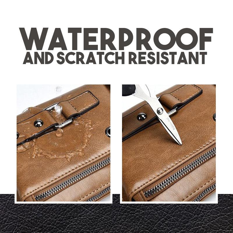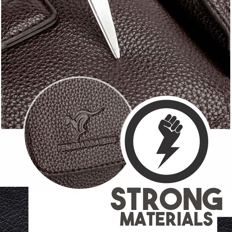 It is made of PREMIUM QUALITY GENUINE LEATHER that is WATWERPROOF and STRUDY and DURABLE. It has a ROOMY COMPARTMENT that is PERFECT for your ESSENTIALS, a BACK POCKET, FRONT ZIPPER POCKET and FRONT SNAP POCKET.