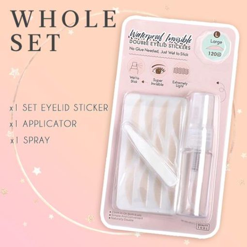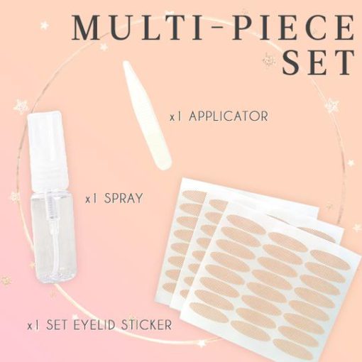 Comes in a big set of multiple eyelid stickers, including applicators and a spray bottle.
