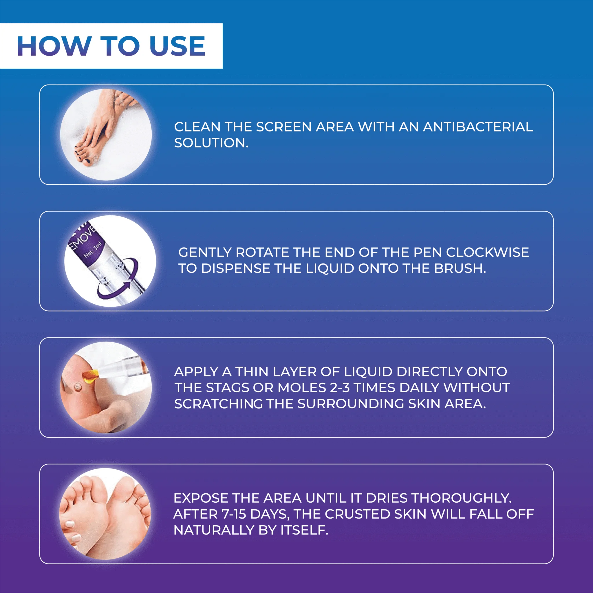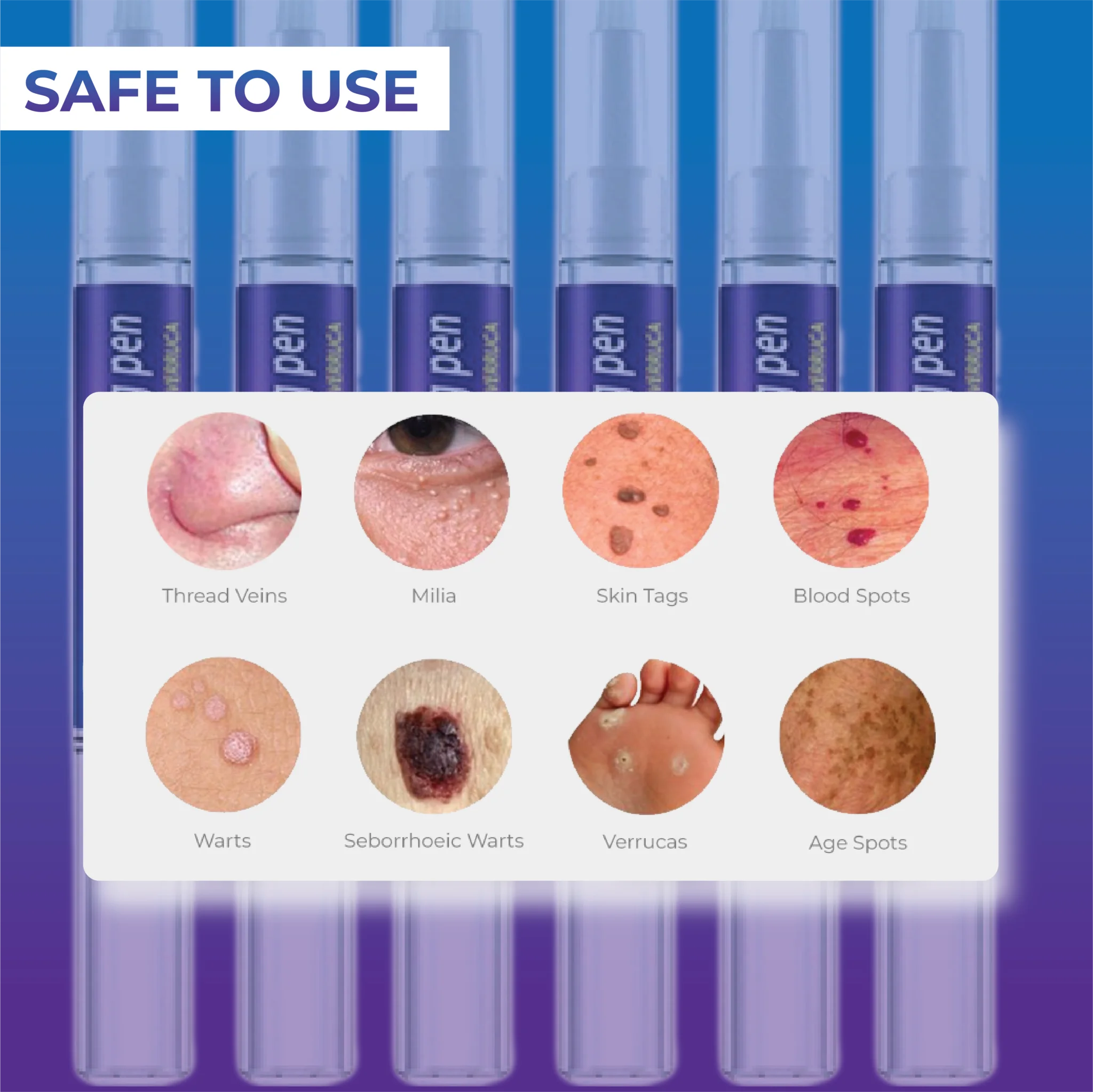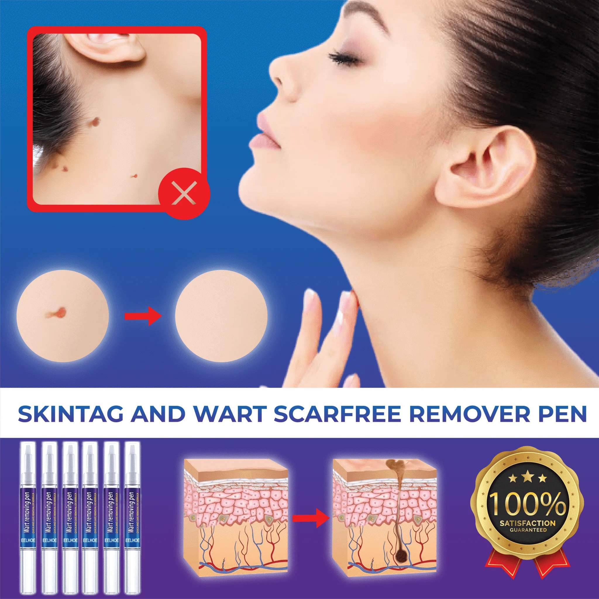 SkinTag and Wart ScarFree RemoverPen is IDEAL for REMOVING Warts, Skin Tags, Skin Marks, Skin Spots, Freckles, Moles, Tattoos, and more. It is SUITABLE for ALL SKIN TYPES. It is SAFE and EASY to use.
