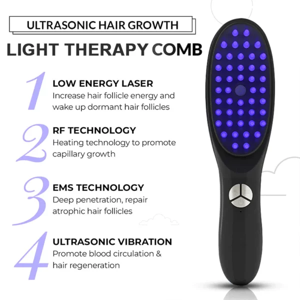 The comb combines light therapy, ultrasonic vibration, and Nano Ion Atomization to stimulate hair growth, improve circulation, and nourish the scalp.