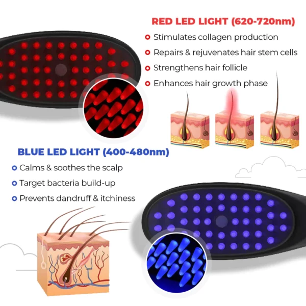 Another study in 2019 demonstrated that blue light therapy effectively reduced scalp sebum levels by 30% and improved symptoms of dandruff. These findings provide empirical support for the positive effects of blue and red light in a hair growth comb.