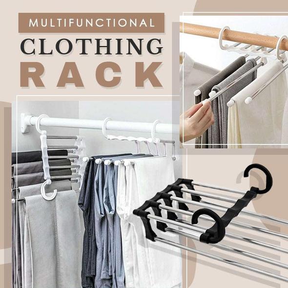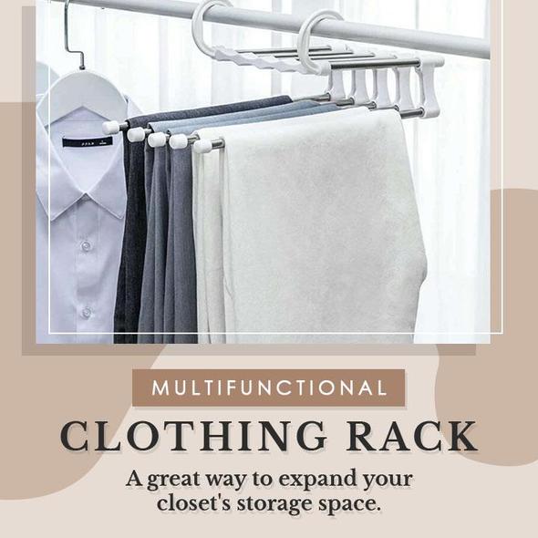 Organizing your closet has never been easy with the help of this Multifunctional Clothing Rack! It can go from hanging horizontally to vertically by unhooking one of the hooks, to fit more clothes and keep them wrinkle-free.