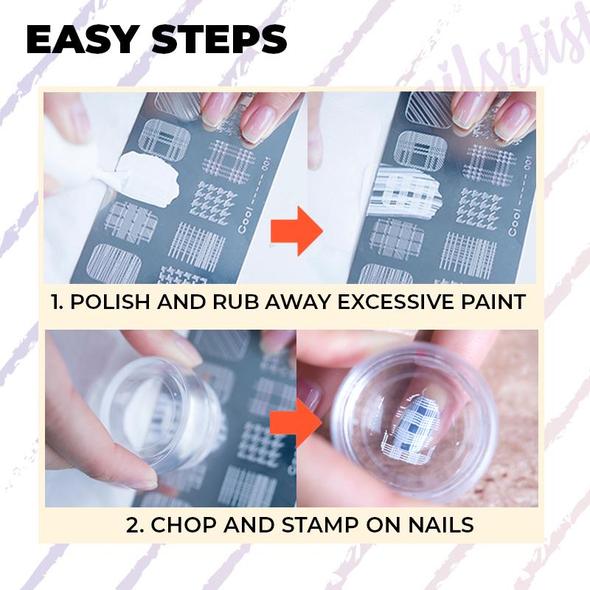 I love this stamping set! After a couple tries, it was super easy to stamp all my nails really fast. I clean the plate and scraper with acetone. Then I use a lint roller to get the polish off the jelly stamper. DO NOT use acetone on the stamper, it will ruin it! Trust me I made that mistake already.Great kit for the price. Put polish on (not too much), scrape, and stamp right away so it doesn’t dry. I also use a liquid latex type polish on the skin around my nails so it’s an easy cleanup.