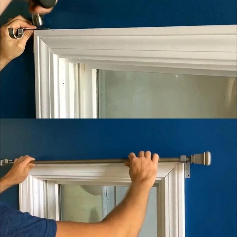 - It’ll make two tiny holes the size of a thumb-tack, and by using the leverage of a bar that goes alongside the edge of the frame, it safely holds the curtain bar up with ease.