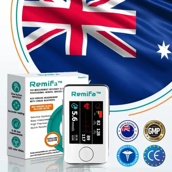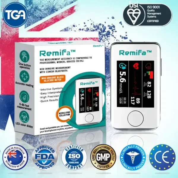 Remifa™ offers a blood glucose meter that is certified by the Australian Medical Association (AMA), the U.S. Food and Drug Administration (FDA), and the European Conformity (CE) mark, ensuring the highest standards of quality and safety. Designed and manufactured in Australia, this device meets rigorous international standards, making it an essential tool for accurate and reliable blood glucose monitoring in both Australia and Europe.
