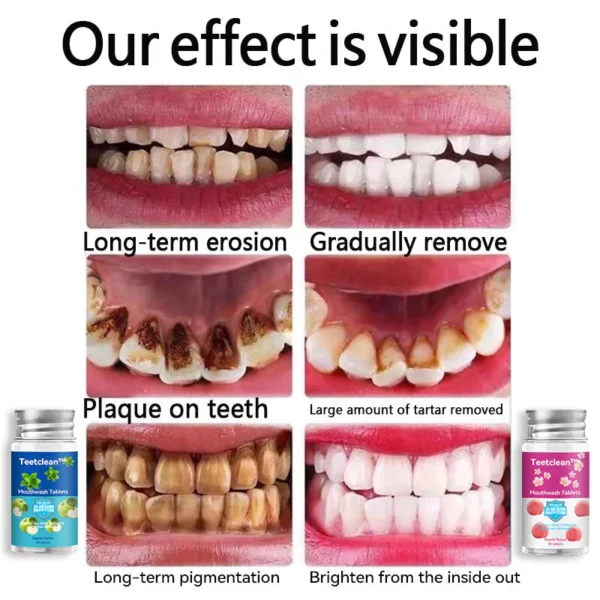 Teetclean™ is the newest product certified by the American Dental Association and recommended by dentists. Perfectly solve all oral problems, including dental calculus, bad breath, oral ulcers, dental caries, bleeding gums, tooth sensitivity, gingivitis, loose teeth, periodontitis, gingival swelling, tooth damage, tooth loss, etc., without any side effects. Made from 100% natural herbs. Suitable for everyone including children, young and old. “