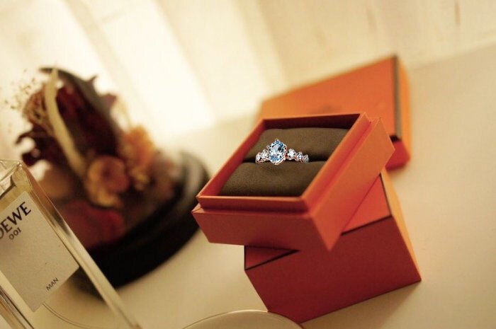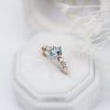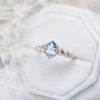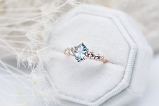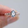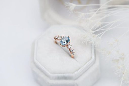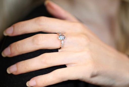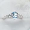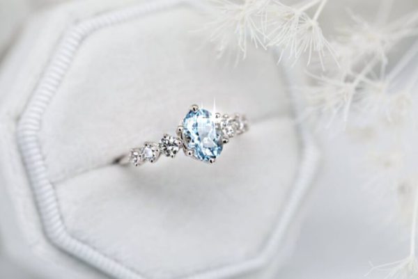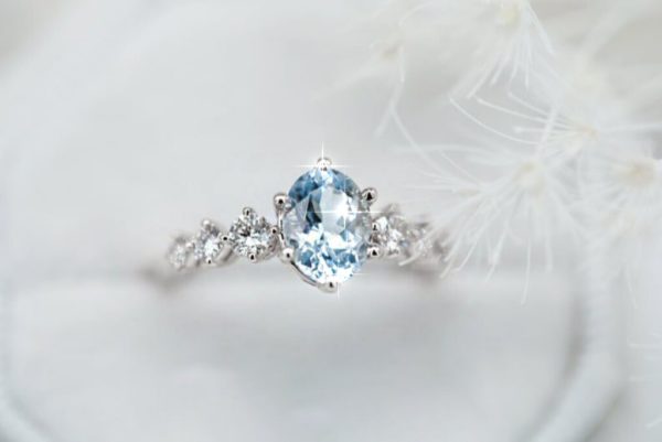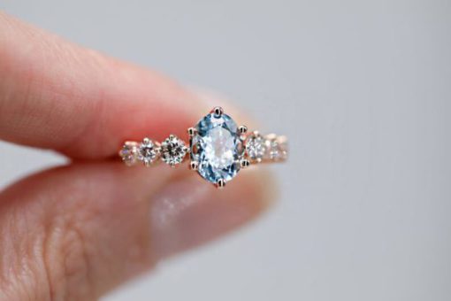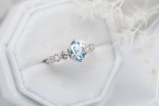 The beautiful oval aquamarine engagement ring is made with a classic design and is set with three lovely white diamonds on each side.