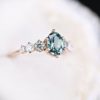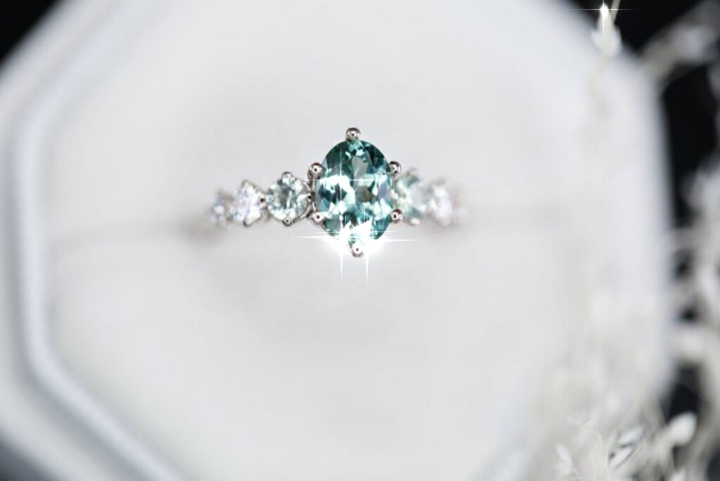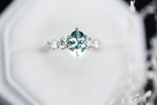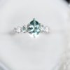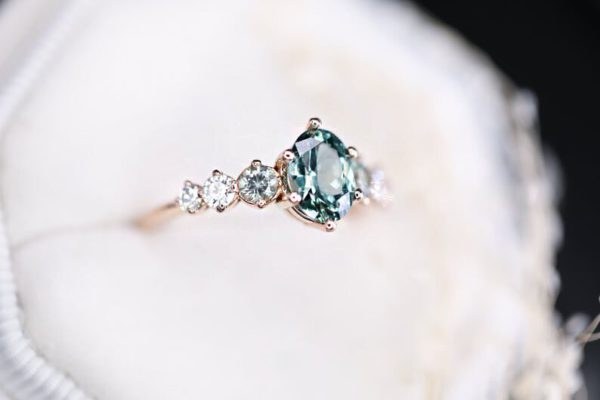 This sapphire was mined in Montana, USA, is untreated and showing naturally changes colors in different lighting from slightly greenish blue to slightly bluish green. Sparkling and gorgeous in a cluster setting with montana sapphires and diamonds on either side.