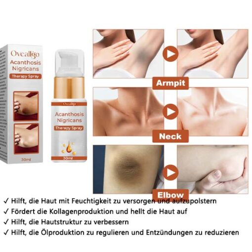 Wir stellen vor: Oveallgo™ Acanthosis Nigricans Therapiesprayy – die revolutionäre Lösung zur Verbesserung des Erscheinungsbilds dunkler und verdickter Haut im Zusammenhang mit Acanthosis Nigricans. Verabschieden Sie sich von der Verlegenheit und Frustration, die durch diesen Hautzustand verursacht werden, und genießen Sie die Schönheit einer klaren und ebenmäßigen Haut.