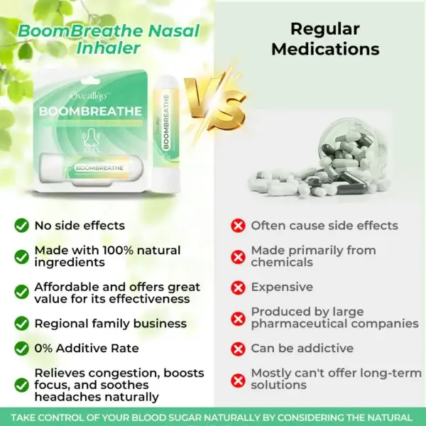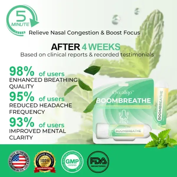 If you’re struggling with nasal congestion, headaches, or brain fog, Oveallgo™ BoomBreathe Ultra Nasal Inhaler offers a 100% natural solution that provides immediate relief and long-term wellness. Noticeable improvements occur within just 5 minutes, and consistent use supports your well-being in only 4 weeks.