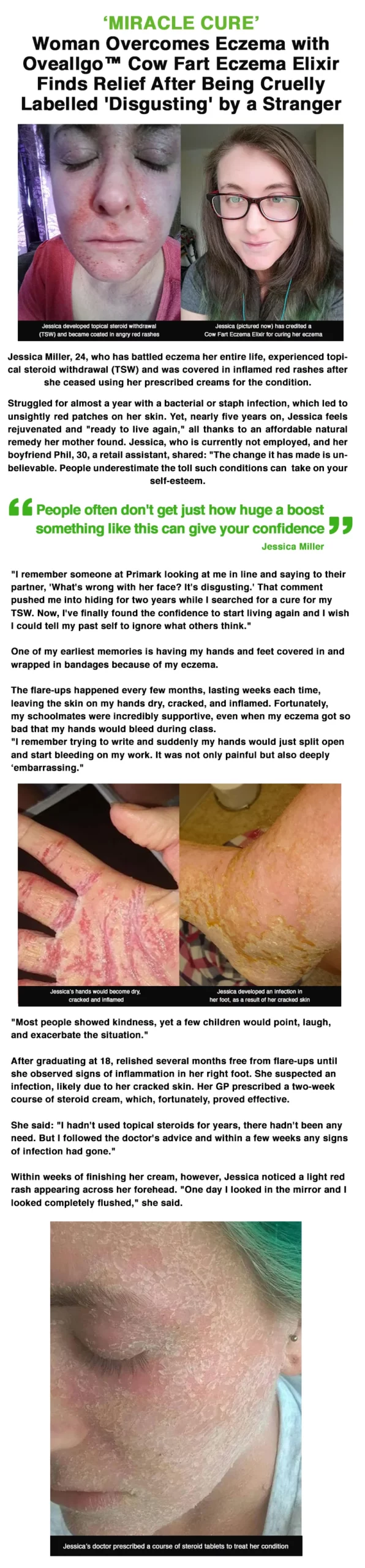 The product’s steroid-free, natural composition avoids harsh chemicals like parabens, artificial fragrances, petrochemicals, and SLS, reducing the risk of irritation and supporting long-term skin health. Thus, Oveallgo™ Cow Fart Eczema Elixir offers a comprehensive, natural solution for a broad range of skin issues.