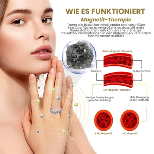 Der Oveallgo™ Meliora Magnetit Kreuz und Quer Lymphvital Ring hilft genau dabei: Er steigert die Blutzirkulation im Körper und regt gleichzeitig die Bewegung der Lymphflüssigkeit an, während Sie sich im Alltag bewegen – eine revolutionäre neue Art, Ihren Körper zu entgiften. Er arbeitet mit Infrarotstrahlung, die das Gewebe direkt unter der Hautoberfläche erwärmt, so dass es sich leicht ausdehnt und mehr Flüssigkeit durch die Lymphbahnen fließen kann, was das Lymphsystem stimuliert und gleichzeitig die Durchblutung und den allgemeinen Gesundheitszustand verbessert.