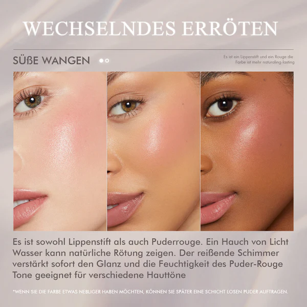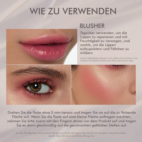 Stellen Sie sich ein einziges Produkt vor, das sich mühelos an Ihre einzigartige Hauttemperatur anpasst und den perfekten Hauch von Rosa auf Ihren Augen, Wangen und Lippen zaubert. Dieses vielseitige All-in-One-Wunder verspricht nicht nur Bequemlichkeit, sondern auch eine bezaubernde Verwandlung und gewährleistet, dass jede Anwendung so einzigartig und lebendig ist wie Sie. Umarmen Sie den Reiz von natürlichem, strahlendem Make-up, das sich mit Ihnen verändert und jeden Moment zu einer Gelegenheit macht, zu glänzen.