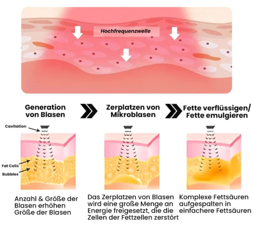 Durch den Einsatz von Vibrationen wird an der Oberfläche der zu behandelnden Fettzellen eine kleine Blase erzeugt, die zu einem Prozess führt, der unglaublich erscheinen mag. Durch den erhöhten Druck, der durch die Vibration entsteht, dehnen sich die Fettzellen aus und platzen schließlich auf, wobei eine Flüssigkeit zurückbleibt, die als Abfall ausgeschieden werden kann.
