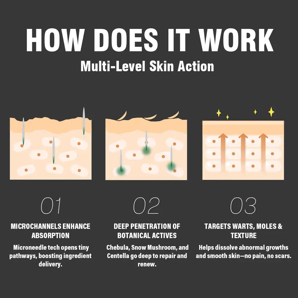 Oveallgo® uses micro-reedle delivery—ultra-fine particles that open microscopic channels in the skin. This allows the active botanicals to reach the source of warts and moles without causing irritation or damage.