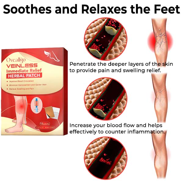 Introducing Oveallgo™ VeinLess Immediate Relief Herbal Patch – the solution you’ve been searching for to ease the discomfort caused by varicose veins. Our herbal patches are specially designed to provide immediate relief to the affected area, promoting healthy blood circulation and reducing swelling and inflammation.