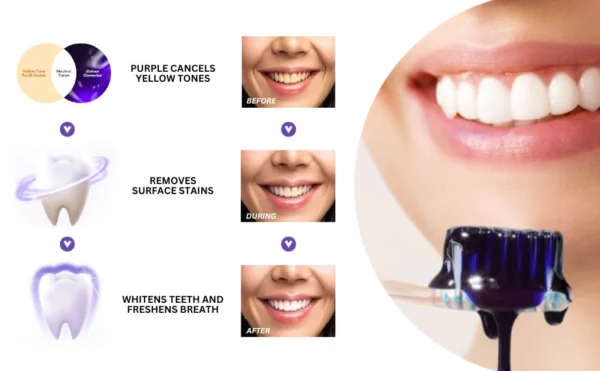 Oveallgo™ Whitening Purple Mousse Toothpaste utilizes a combination of ingredients designed to brighten teeth. It has color-correcting technology that utilizes the principle of color theory. Purple, being opposite to yellow on the color wheel, counteracts and cancels out the yellow undertones on teeth, revealing a brighter shade of white.. Additionally, it contains gentle abrasives that help remove surface stains, helps break down deeper stains over time. The foamy mousse texture allows for effective distribution of these components while also providing a refreshing brushing experience. Regular use can lead to a visibly brighter and whiter smile.