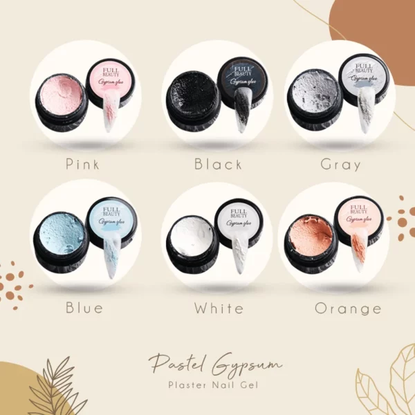 Create the gorgeous, textured gypsum plastered manicure style effortlessly in the comfort of your own home!SAFE AND STRONG This Pastel Gypsum Plaster Nail gel is professionally made with no harmful chemicals, and carries nano binding particles that keeps the nails from chipping, discoloring, and lifting. Can choose up to 6 colors. Applicable to Hands and Foot nails. Versatile and Extravagant DesignsYou can make your own creative and unique ideas. Can fit any style on any occasions. Easy to remove for fast changing. SIMPLE AND EASY TO APPLY You can design your on way, just put the gel on your Nails then cure with UV light for 30 seconds. You can also add your own elements for additional design, no need to put clear coat since it have a good adhesive formula but option for a glossy result. SPECIFICATIONS: