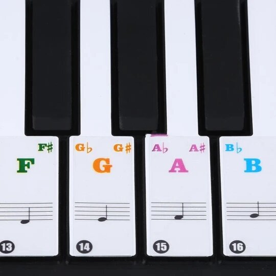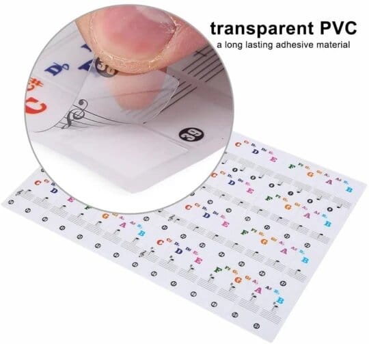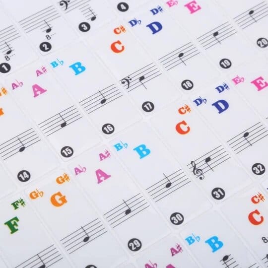 Very helpful tool for those new to the piano. Shows where to find notes on staff and what note it is. They stay on well.