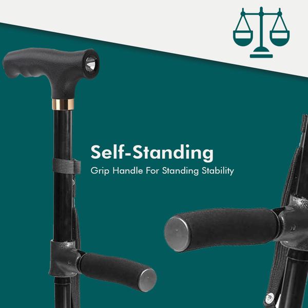 Maximum ground contact on the non-scratch rubber base. Extra wide, quad tipped base allows the cane to stand firmly on its own on the 4″ base. Added with a grip handle for standing stability. No need for you to get attended when standing.