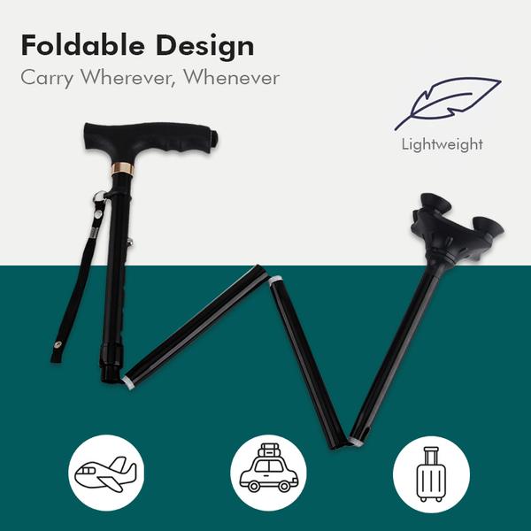 Easily folds to compact 11″ for easy storage and traveling. When unfolded, the cane securely locks in position to provide safety and stability. The collapsible cane fits into a walker bag, purse and carry-on luggage.