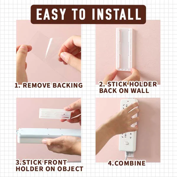 The multifunctional holder comes with 2 parts where you can attach the first panel on the wall and the second panel on the power strip itself. It allows you to smoothly disassemble the power bar multiple times onto the wall and reattach it anytime without removing the main mount. No need to constantly reapply adhesion anymore, just slide your power strip to the mount to attach and slide out to remove.