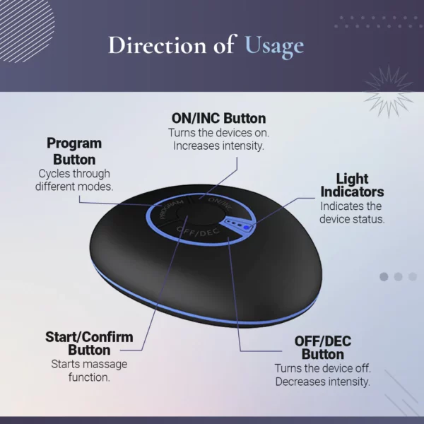 - Press the “ON/INC” button to increase the intensity and the “OFF/DEC” button to decrease the intensity after setting the intensity to your preference.