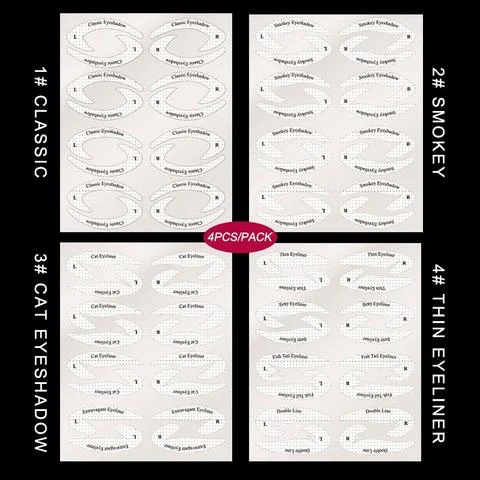 It contains 4 templates (1# Classic, 2# Smokey, 3# Cat Eyeshadow, 4# Thin Eyeliner) and 10 different ways to draw eyeliner and eyeshadow, meeting your eye makeup needs such as double up / fish tail / basic / luxurious / cat line / simple eyeliner and smokey / everyday / bold / classic / drama eyeshadow.