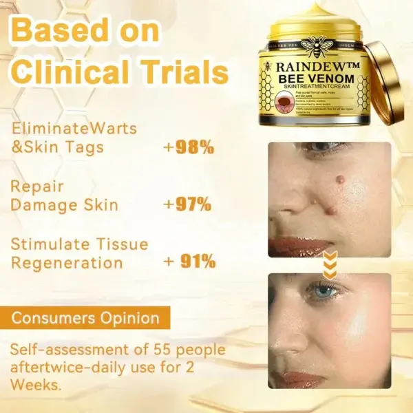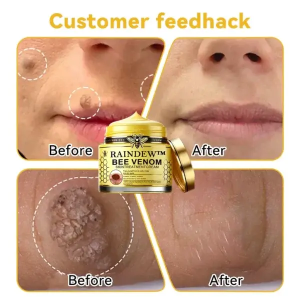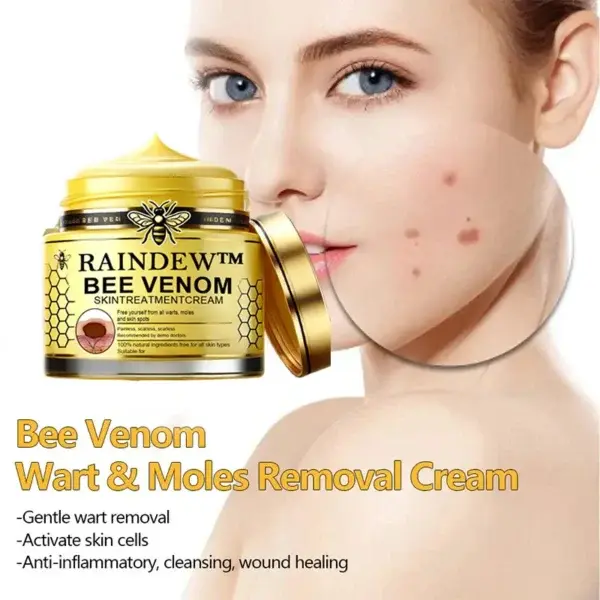 Raindew™ Bee Venom Skin Treatment Cream provides a solution by harnessing the potent properties of bee venom to target various skin irregularities such as skin tags, moles, warts, and blemishes. Enriched with active ingredients from bee venom, this advanced formula works to break down and gently remove unwanted growths.