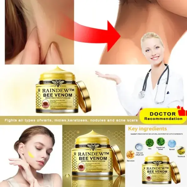 “As an experienced dermatobiologist with 15 years in clinical practice, I’ve treated many patients with warts. Based on a 2023 study published in the International Journal of Dermatology, I found that bee venom peptides inhibit the proliferation of keratinocytes in warts and accelerate the death of affected skin cells, causing the warts to fall off within one to two weeks. After extensive research, I developed the Raindew™ Bee Venom Skin Treatment Cream, a groundbreaking formula combining bee venom and plant-based ingredients. This cream offers an effective solution for complete wart removal and skin restoration. I highly recommend it as the ultimate treatment option.“
