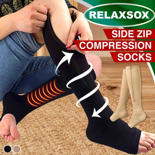 | With the addition of a zipper these socks become incredibly easy to put on and take off, something many of my patients struggle with. It also helps with prevention and formation of varicose and spider veins.Graduated Compression Regular use can help prevent the appearance of varicose veins by decreasing the venous pressure on the surrounding tissues in the lower extremities, providing long term benefits. Decreases Venous Pressure The RelaxSox Side Zip Compression Socks 20-30 mmHg gradual moderate compression, targeted compression zones provide varying levels of support from moderate to extra firm. Help relieve pain.lifting power.