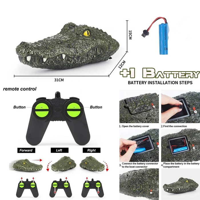 Have 2.4 Ghz Remote Controller: Alligator head RC boat for adults and kids fun the water. This high-quality crocodile boat equipped with a 4-channel 2.4 GHz remote controller with a 50-meter signal range in pool, pond and lakes.