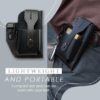 Well made from fairly heavy leather and heavy stitching, holds my IPhone 11 with standard (thin) silicone case snugly but has loosened up with use and is easily removed. The pocket holds a multi tool, & ID cards or other small items and has a simple stud closure which is secure & easy to use.