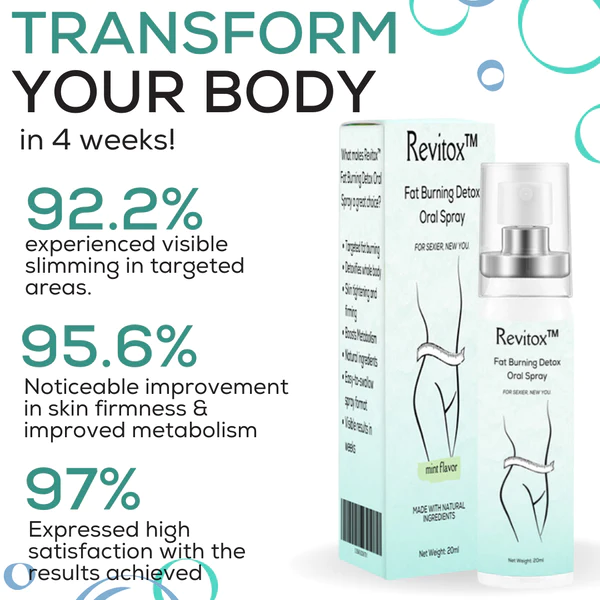 Introducing Revitox™ Fat Burning Detox Oral Spray, the revolutionary solution that targets fat burning and boosts your metabolism. With its exceptional blend of potent natural ingredients, Revitox™ provides a comprehensive approach to slimming and revitalizing your body. Say goodbye to unwanted fat cells and prevent future fat accumulation and cellulite reoccurrence.