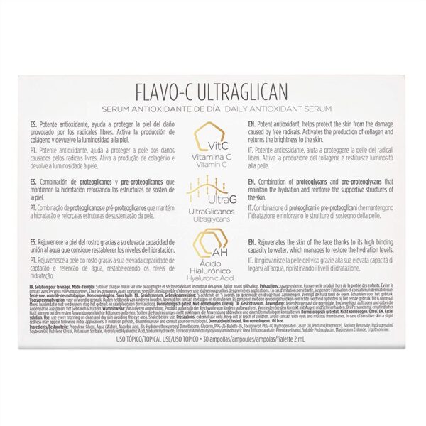 We recommend using half the contents over the face, neck and neckline, avoiding the eye area. Flavo-C Ultraglican vitamin C ampoules come with a resealable cap that ensures product integrity for 48h after opening.