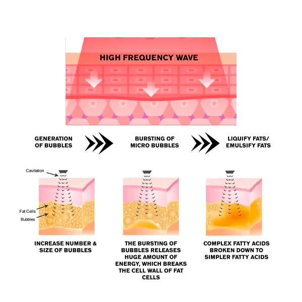 This product uses High-frequency technology to destroy fat through cavitation and muscle stimulation, which sends vibrations into targeted fat cells and leads to their destruction. This can help you increase metabolism and improve circulation so that excess fat is eliminated as waste through your lymphatic system. In addition to destroying fat cells, the increased muscle contraction from ultrasonic vibrations can also help you achieve more effective workout sessions at home or in the gym!