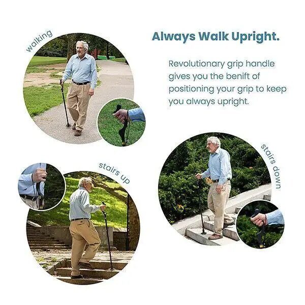 A revolutionary ergonomic grip handle, helps you walk more upright and improves your line of sight which helps to maintain balance and mobility, let you walk confidently and feel more secure when walking on uneven surfaces, making it easier to stand from a seated position.