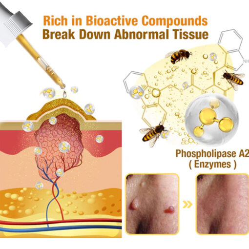 Bee venom contains several bioactive compounds, including melittin, apamin, and adolapin which has been scientifically proven to tackle skin tags or warts effectively. Among its arsenal of enzymes, phospholipase A2 stands out for its ability to break down abnormal tissue, simplifying the removal process of skin tags or warts.