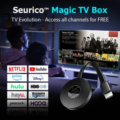 This is what the Seurico TV Evolution looks like. It’s a small box that plugs into the HDMI port on your TV. The advantage is that all TVs around the world have been equipped with an HDMI port since 2003, so almost anyone can use it.