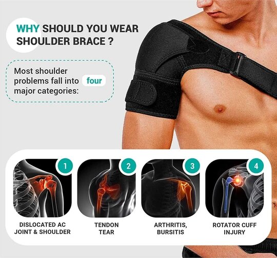 Shoulder Brace Sling Support is a SLING BAND that STABILIZES the SHOULDER to MINIMIZE the UNSAFE MOVEMENT and PREVENTING INJURIES and PROVIDES QUICKER RECOVERY TIME. It RELIEVES PAIN, SWELLING and INFLAMMATION that is caused by SPRAINS, STRAINS, SHOULDER DISLOCATION, ROTATOR CUFF INJURY, FROZEN SHOULDER and ARTHTITIS. It EFFECTIVELY PROVIDES COMPRESSION and KEEPS the SHOULDER ELEVATED to IMPROVE BLOOD FLOW. It CORRECTS the POSTURE to PREVENT LEADING to PAIN.