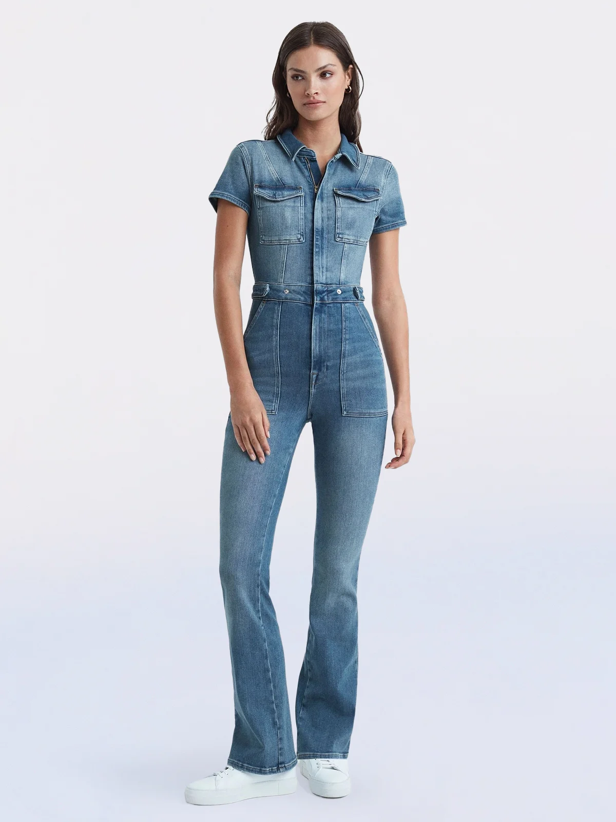The skinny fit of the jumpsuit accentuates your figure, it snaps at waist with high recovery denim for all day support. It will hug your body closer, shape and lift the butt more.