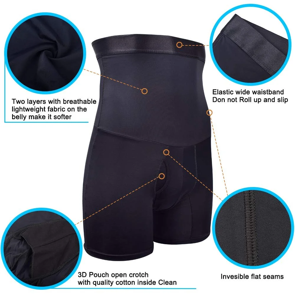 😍😍😍[EXCELLENT COMFORT] This men tummy control shorts with 3D POUCH SUPPORT design on crotch, to fit the male physiological feature. The light, highly-elastic fibre (88% Nylon + 12% Spandex) offers full range of movement, extremely breathable, sweat absorbing and heat releasing. Not only maintain the natural texture, also keep the lasting elegant sense and excellent comfort. This tummy shaper for men offers comfortable wearing experience even in the hot summer.