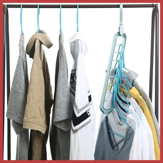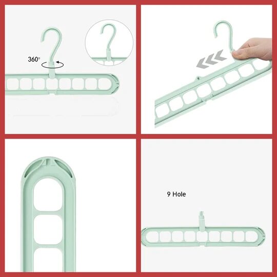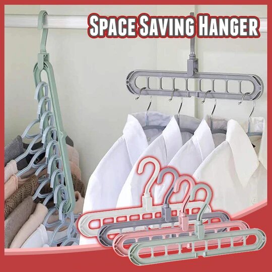 Space Saving Hanger is a MULTIPLE PORTED HANGER that can HANG DIFFERENT CLOTHES at the SAME TIME. It has NINE HOLES that can be USED to HANG CLOTHES. It has an ANTI-SKID DESIGN making it SECURED and SAFE.