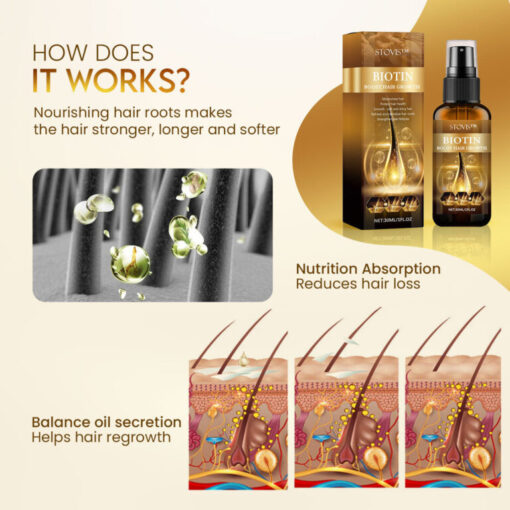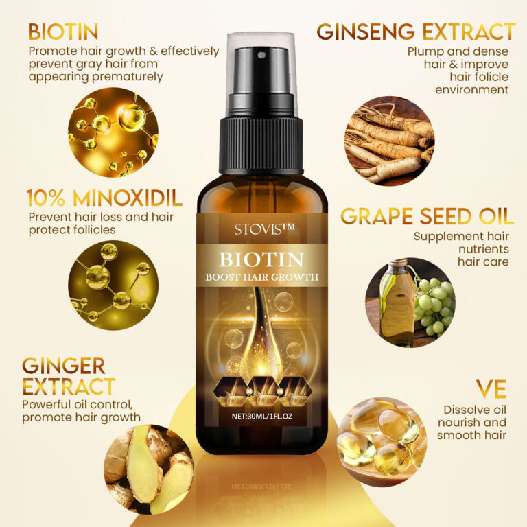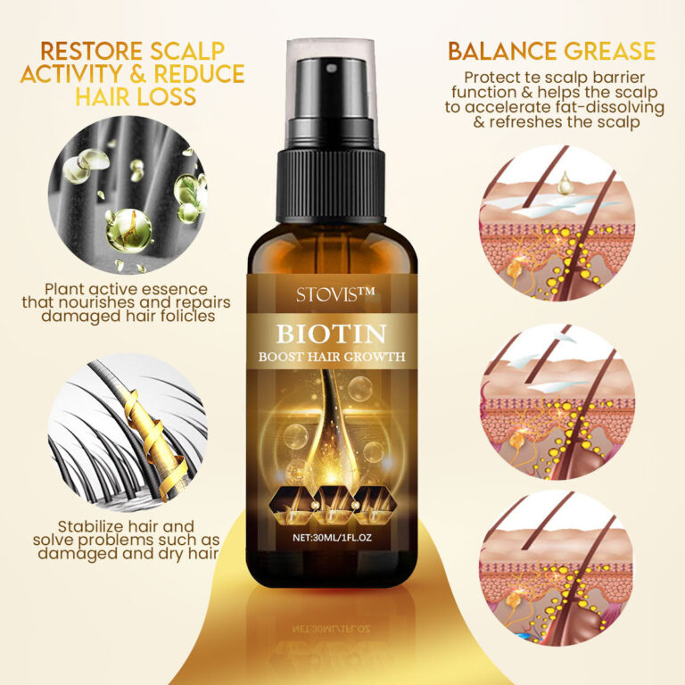 Stovis™ Biotin Premium Boost Hair Growth Spray penetrates deeply into the scalp to nourish hair follicles and maintain a healthy scalp environment. The spray delivers nutrients and oxygen to hair follicles, increasing the size of hair follicles, which promotes the growth of thicker, stronger hairs. When used daily, Stovis™ Biotin Premium Boost Hair Growth Spray can help promote healthy hair development.