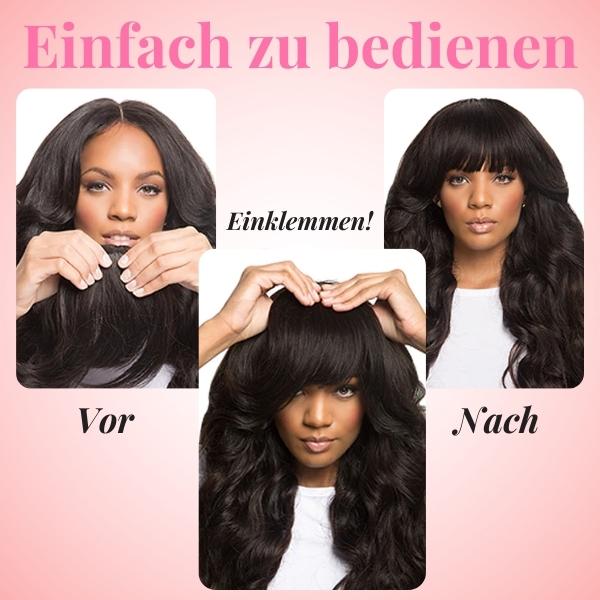 Mühelose Stilveränderung: Mit StyleSnap™ Clip-In Pony können Sie Ihren Look innerhalb weniger Minuten mühelos verändern. Verabschieden Sie sich davon, darauf zu warten, dass Ihr Haar herauswächst oder stundenlang beim Friseur zu verbringen. Unsere Clip-In Bangs bieten eine schnelle und problemlose Möglichkeit, Ponyfrisuren zu erhalten, die Ihr Gesicht perfekt umrahmen.