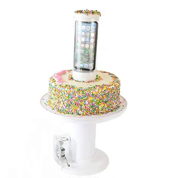 How it works is, before you put your pre-made cake onto the unique popping surprise cake stand just place a gift, whether it’s cash, a new phone, candies, or other awesome stuff into the tube in the center of the cake stand. Then just press the tube down into the launching mechanism.